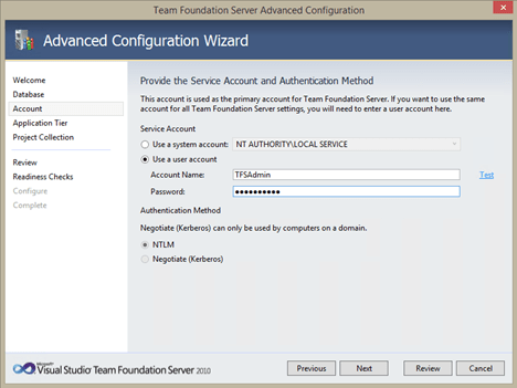 Enroll the machine in your AD in case you are working on an Active Directory environment. Just create a user called TFSAdmin with admin rights on the local machine. Verify that the account you will use to install Team Foundation Server is a member of the Administrators security group on the server where you will install Team Foundation Server.Note: Other service accounts should be set up depending on the TFS components that are going to be active. For more information: http://msdn.microsoft.com/en-us/library/ms253149(v=vs.100).aspx