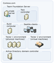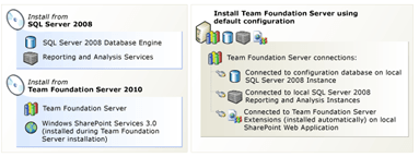 | Here all server components are deployed on a single physical server (this is the case of the smallest VM I have set up for testing. This is usually designed for small product development team with less than 50 users. Team Foundation Build and the team’s test components can be installed in the same server as well.For reporting services, you can install SQL Server 2008 with SSRS and SSAS on the same machine and either use Sharepoint Services v3 that comes with the Windows Server or Install Sharepoint 2010 on the TFS Machine. If you just use the SQL Server Express you have to realize that the integration with Sharepoint will not exist.If you install WSS 3.0 instead Sharepoint some dashboards won’t be available either (http://msdn.microsoft.com/library/dd380719%28VS.100%29.aspx) |
