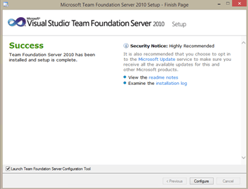 After the installation finish, select the checkbox “Launch Team Foundation Server Configuration Tool” and click on Configure.