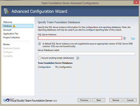 topology as I already have installed SharePoint Server 2010 and SQL Server 2008. Just make sure you are filling up correctly the wizard blanks like the SQL Server Instance (use the Instance name that you have created and click on Test)