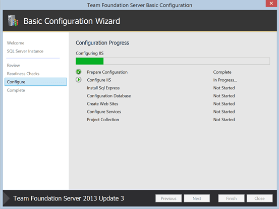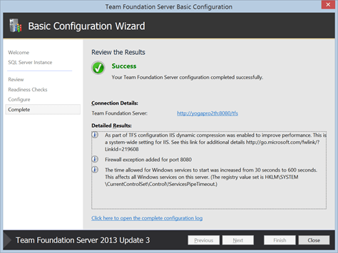 - Once the installation is done, it’s time to configure the server. Just a quick reminder, when you install TFS 2013 on a client machine, is only intended for a few concurrent users, you will use SQL Server Express and we are trying the have the most compact TFS installation possible. The main purpose of installing it in our Windows 8.1 is to have Source Control, Work Item tracking and Build Services, but you will see that you can do much more. So let’s select the Basic configuration